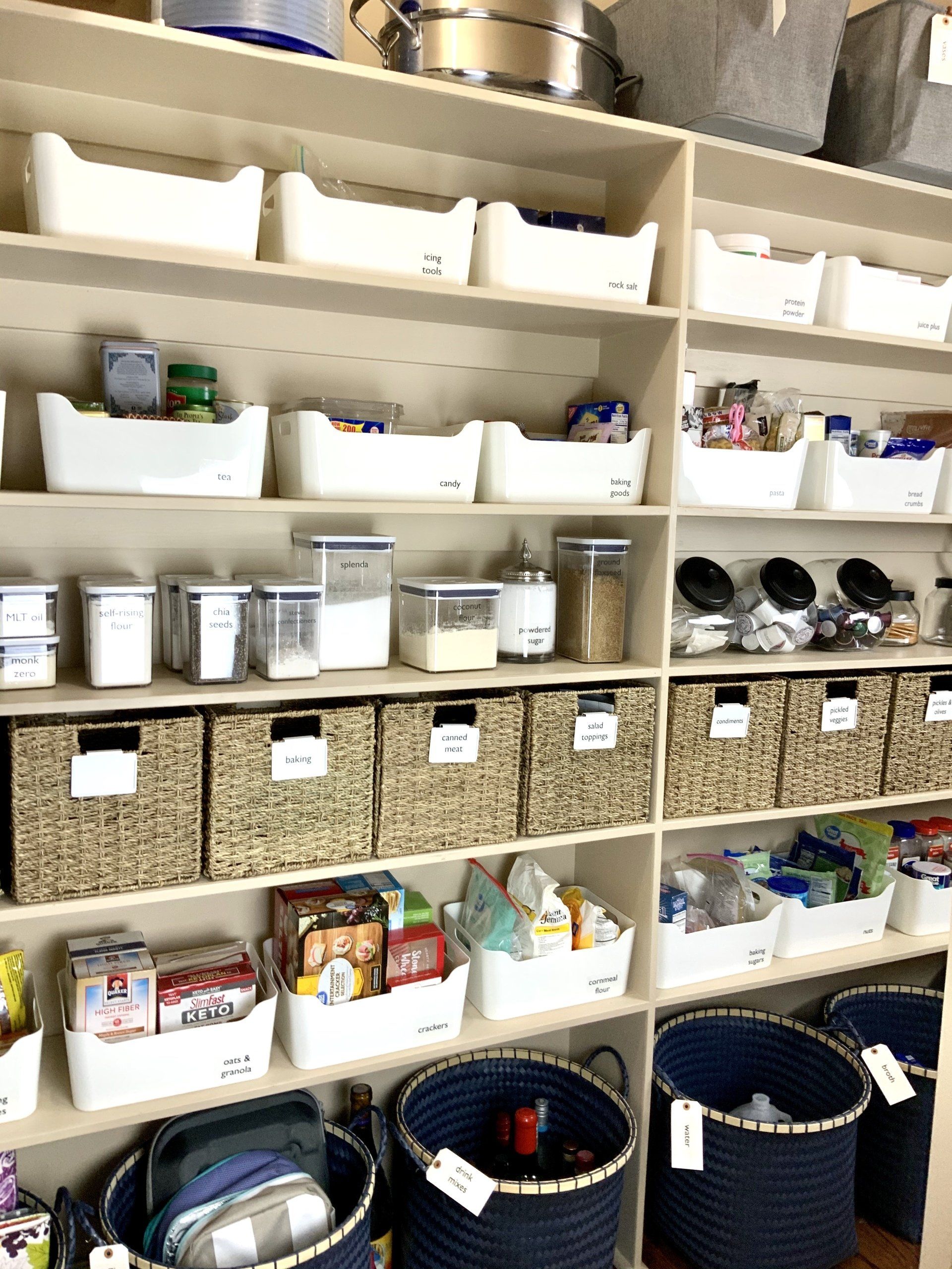 In this pantry, all of the baking items are placed together, the beans are together, the spreads are together, etc.